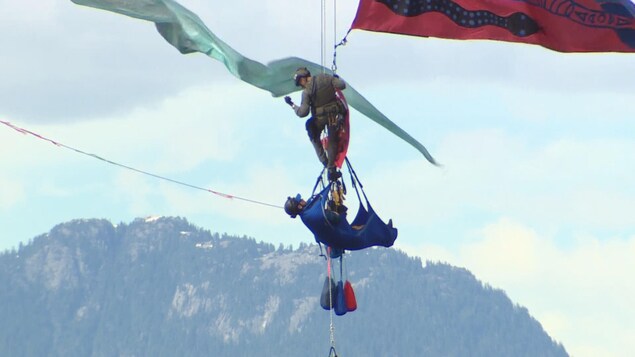 Un agent descend en rappel vers l'un des manifestants attachés sous pont. Les militants de Greenpeace veulent empêcher un pétrolier de passer pour marquer leur opposition à Trans Mountain. Photo : Radio-Canada