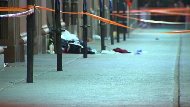 Un itinérant de 53 ans a succombé à ses blessures après avoir été poignardé par un autre itinérant au centre-ville de Montréal, le 14 juillet 2018. Photo : Radio-Canada/Jean-Claude Taliana