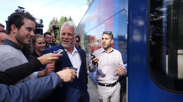 En sortant du club de golf East Angus, Philippe Couillard n'a pas voulu s'arrêter pour répondre aux questions des journalistes, assurant seulement que Guy Ouellette lui avait réitéré sa loyauté envers le PLQ. Photo : Radio-Canada/Bruno Boutin