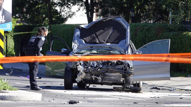 La voiture n'ayant pas stoppé au feu rouge a violemment percuté un autre véhicule ainsi qu'un piéton. Photo : Radio-Canada/Mathieu Daniel Wagner