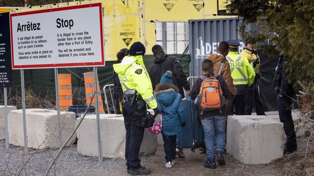 Une famille de Colombiens est arrêtée par des agents de la Gendarmerie royale alors qu'ils franchissent illégalement la frontière entre le Canada et les États-Unis, près de Champlain, dans l'État de New York. Photo : La Presse canadienne/Paul Chiasson