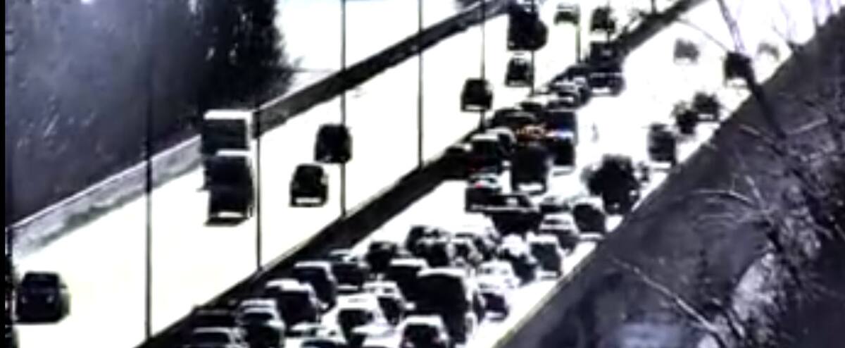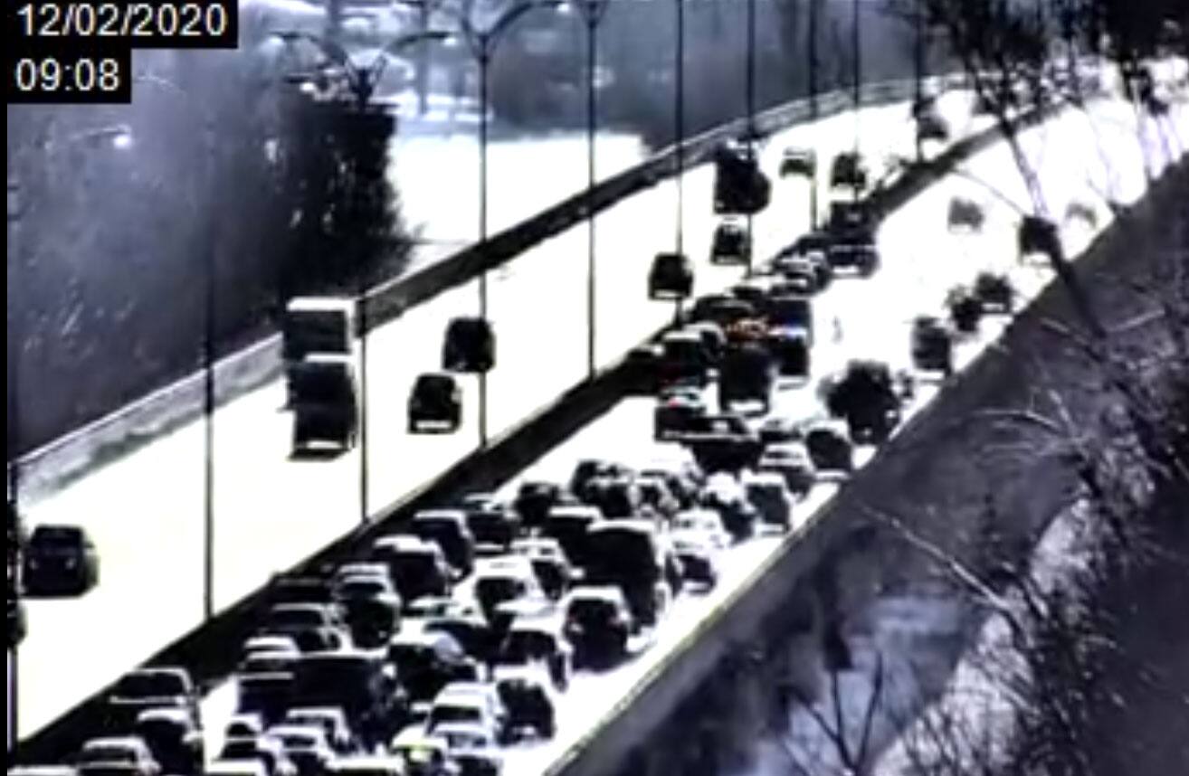 La voie de gauche et la voie centrale sont entravées, ce qui provoque un bouchon de circulation remontant jusqu'à l'autoroute 640.