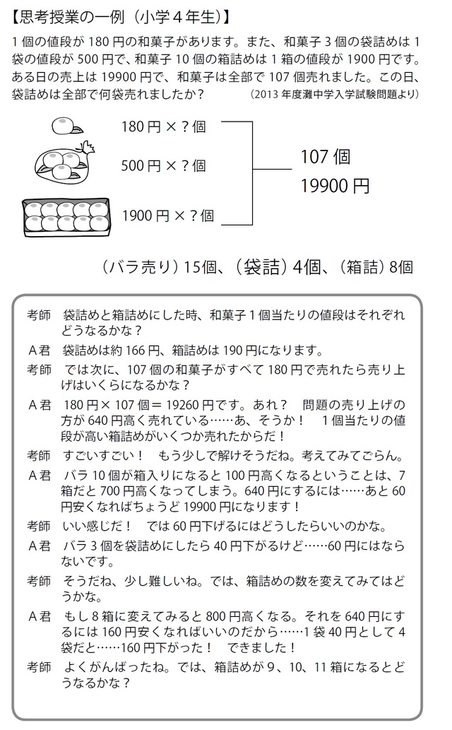 問題文を読みながら、バラだと1個180円だけれど3個の袋詰めになると少し安くなる、それなのに10個入りだと1900円となるのは箱代が入っているからだ………。頭を使えるようになるとは、こういうことを意味します。