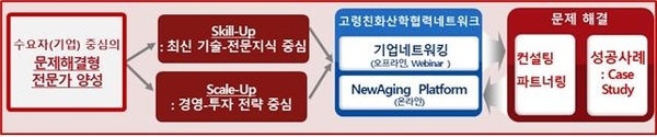 문제해결형 전문가 양성과정으로 나열식 교육방식에서 벗어나 문제해결형 방식으로, 기업․기관이 경험하는 개별적인 어려움을 해결하는데 도움을 준다. 참가자 대상 교육수요조사결과를 토대로 전문지식과 정보(규제, 글로벌동향 등), 산학협력(기업네트워킹, 컨설팅, 리빙랩) 간 통합적 접근을 강조한다. 교육과정은 2개로 전문화되어, Skill-Up과정(최근 지식-기술중심, 고령친화산업 준비중인 기업․기관), Scale-Up과정(기업성장․관리역량․투자전략)으로 운영된다.