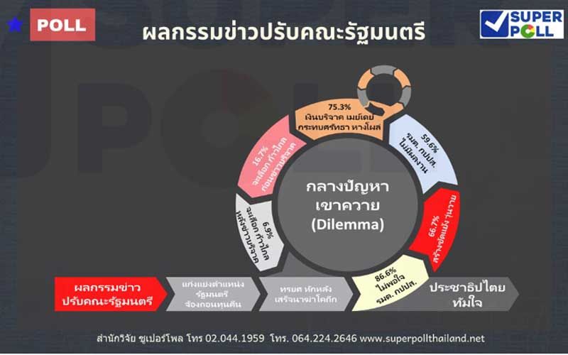 12 กรกฎาคม 2563 ผศ.ดร.นพดล กรรณิกา ผู้อำนวยการสำนักวิจัยซูเปอร์โพล (SUPER POLL) เสนอผลสำรวจภาคสนาม เรื่อง “ผลกรรมข่าวปรับคณะรัฐมนตรี” กรณีศึกษาตัวอย่างประชาชนทุกสาขาอาชีพทั่วประเทศ โดยดำเนินการเก็บข้อมูลแบบผสมผสาน (Mixed Method) ทั้งการสัมภาษณ์ทางโทรศัพท์ การลงพื้นที่และการเก็บข้อมูลในโลกโซเชียลทั้งการวิจัยเชิงปริมาณ (Quantitative Research) และการวิจัยเชิงคุณภาพ (Qualitative Research) จำนวน 2,203 ตัวอย่าง ดำเนินโครงการระหว่าง 5 – 11 กรกฎาคม 2563 ที่ผ่านมา