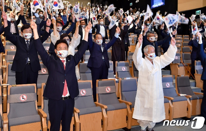 | 지난 15일 75주년 광복절 경축식이 열린 경북도청에 이철우 지사(앞줄 왼쪽) 등이 만세삼창을 외치하고 있다.(경북도 제공) © 뉴스1 |