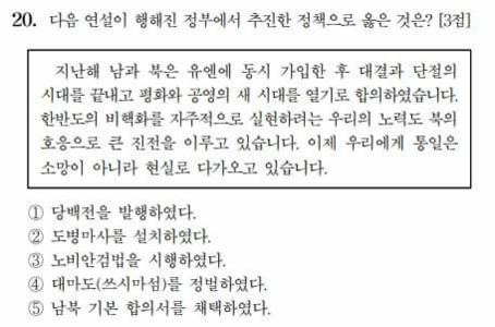 3일 치러진 2021학년도 대학수학능력시험 한국사 20번 문제에 나온 객관식 선택지다. 노태우 전 대통령의 연설문이 보기로 주어지고 ‘해당 연설이 행해진 정부에서 추진한 정책’을 묻는 문제였다.