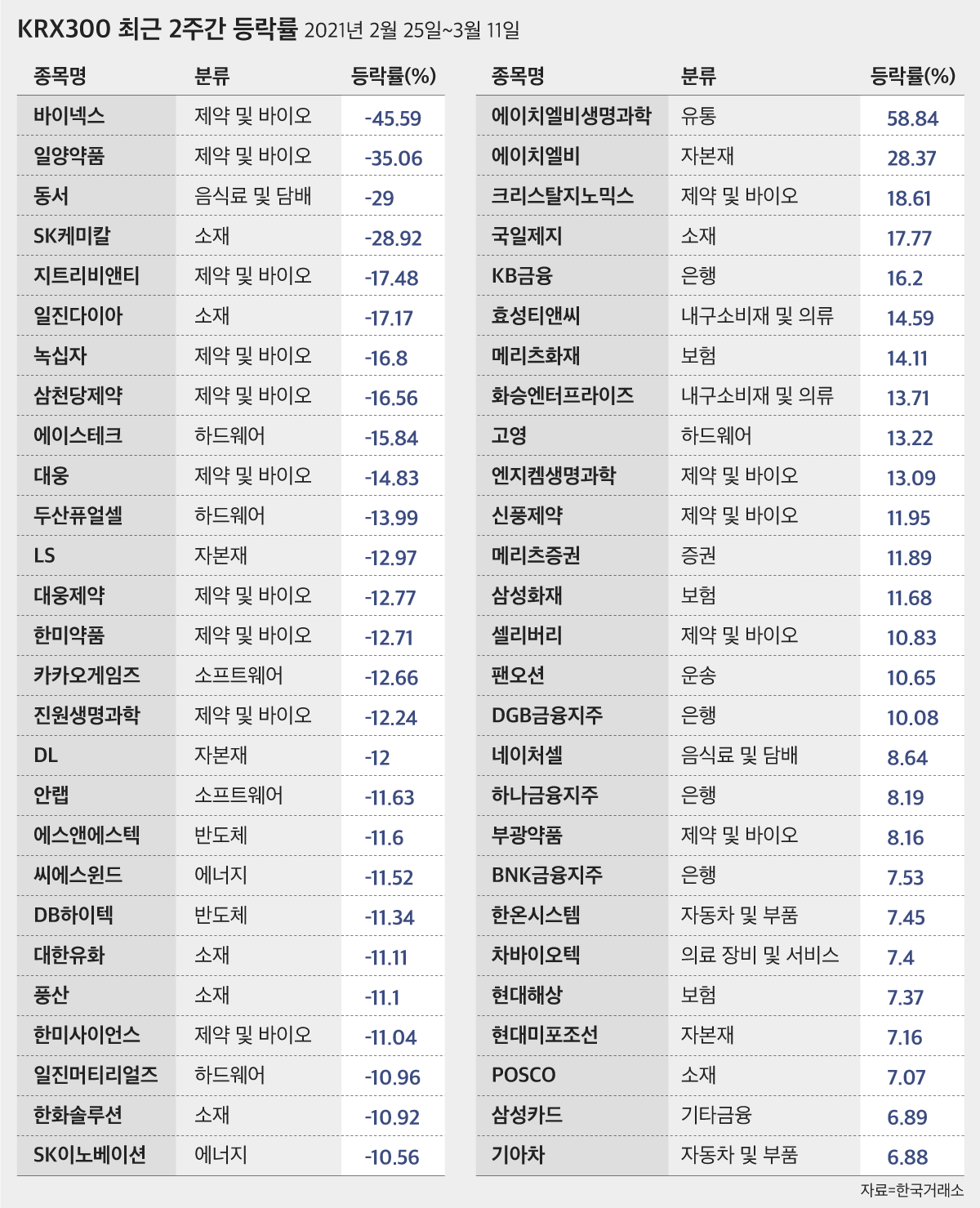 우선 최근 국내 증시에서는 가치주가 이기는 모양새다. 성장주가 잃은 힘을 가치주가 가져가고 있다. 12일 한국거래소에 따르면 지난달 25일부터 전날인 11일까지 KRX300에서 성장주로 분류되는 종목이 대폭 내렸다. 이 기간 제약·바이오 종목이 많게는 약 46%, 적게는 10%대로 하락했다. 게임 종목인 카카오게임즈도 12.66%, 2차전지와 신재생에너지로 분류되는 SK이노베이션과 한화솔루션도 각각 -10.56%, -10.92%였다.