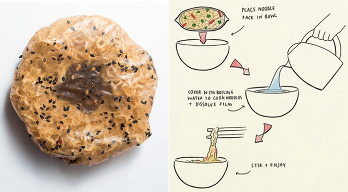 이 회사가 제시한 라면 포장지 개선방안은 바로 스프를 포장지로 만드는 혁신적인 방법이다. 물론 기존의 분말 형태 스프로 포장지를 만든다는 의미는 아니고, 포장지를 대신할 수 있는 식품 성분으로 만드는 것이다.