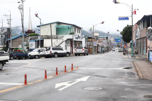 대한민국 본토에서 인구가 가장 적은 지자체인 경북 영양군 소재지가 있는 영양읍 중심가 전경. 왕복 2차로에 가로수와 신호등이 없는 한산한 거리가 이채롭다. 영양=정광진 기자 kjcheong@hankookilbo.com