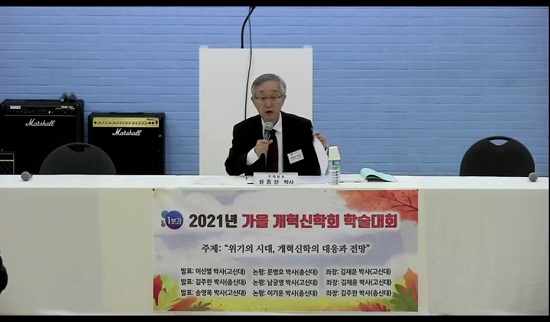 | ▲10월 23일 경기도 안양시 동안구 관양동 열린교회에서 ‘위기의 시대, 개혁신학의 대응과 전망’이라는 주제로 개최된 개혁신학회가을 학술대회(비대면)에서 원종천 박사(아신대 명예교수)가 ‘성화부진에 대한 개혁신학의 대응과 과제: 역사신학적 고찰’이라는 주제발제를 하고 있다. ⓒ 데일리굿뉴스 |