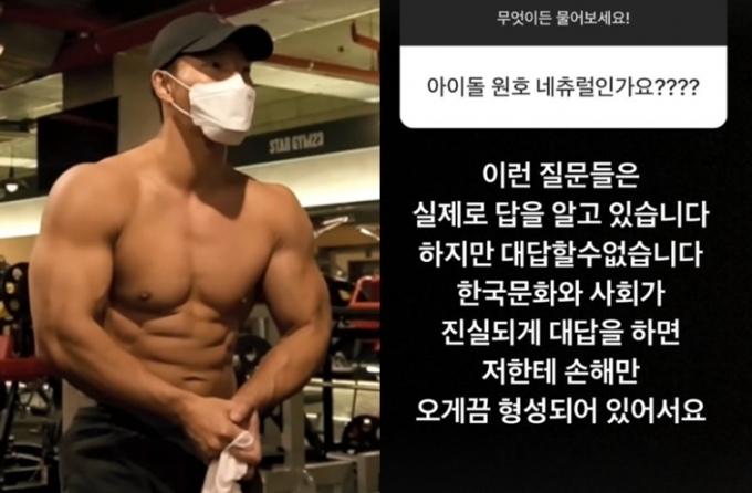 이후 한 누리꾼이 "아이돌 원호는 내추럴(약물을 사용하지 않은 몸)인가요?"라고 묻자 간고는 "이런 질문들은 실제로 답을 알고 있다. 하지만 대답할 수 없다"고 답했다. 이어 "한국문화와 사회가 진실되게 대답하면 저한테 손해만 오게끔 형성되어 있어서"라고 덧붙였다.
